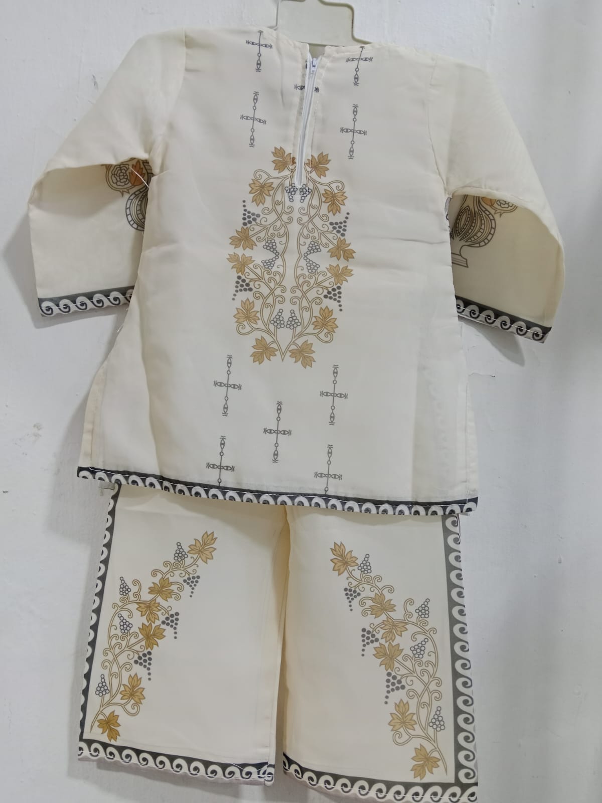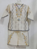 This beautiful cream-colored kids kurta shalwar set offers a graceful and classy look. The kurta features elegant golden and grey floral prints that add a stylish touch. The neckline is enhanced with neat piping and subtle front detailing, making the outfit even more attractive. The sleeves and hem are finished with a contrasting border design that completes the overall look.
